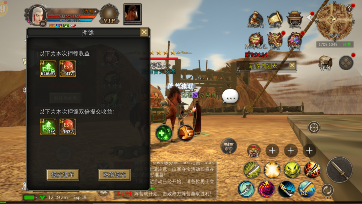 成功抵达目的地后,与贸易商NPC交互可结束押镖并领取奖励。VIP4及时,提交押镖任务时还可以选择领取双倍!